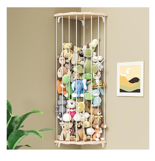 Corner Stuffed Animal Storage Zoo – Adjustable Natural Solid Wood Toy Organizer & Teddy Bear Holder – Large Wall Plushie Cage Shelf with Reinforced Star & Moon Cutouts for Nursery Kids Room