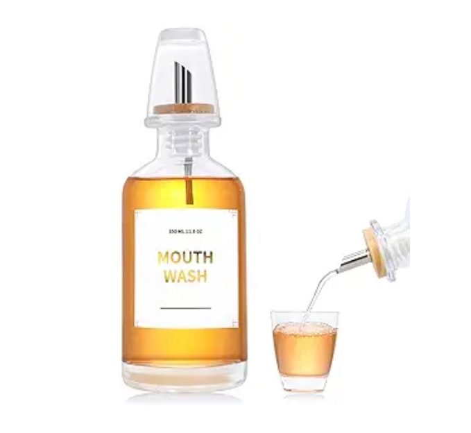 Glass Mouthwash Dispenser for Bathroom with Stainless Steel Nozzle, Reusable Mouthwash Cup and Elegant Gold Sticker(11.8OZ/Clear)