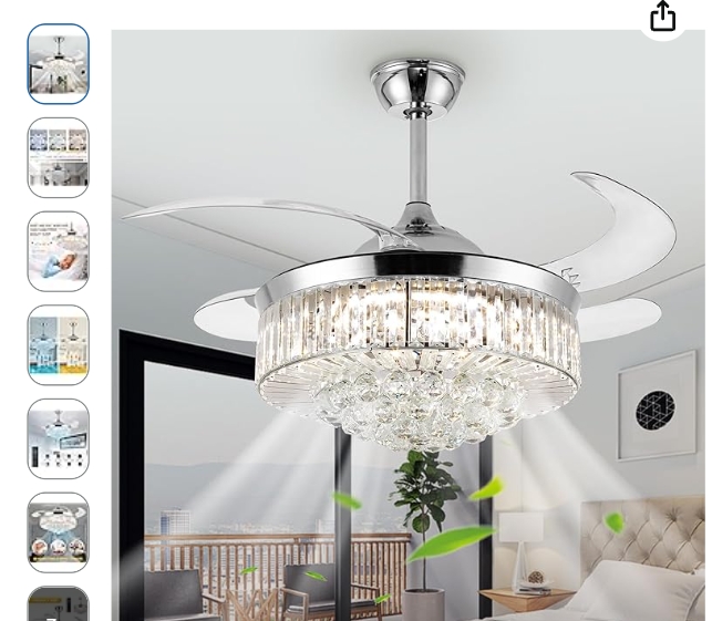 42″ Crystal Ceiling Fan with Light, Silvery Chandelier Fan with Remote, 6 Speeds 3 Colors Changes 4 Blades Retractable Ceiling Fan for Bedroom, Living Room, Dining Room